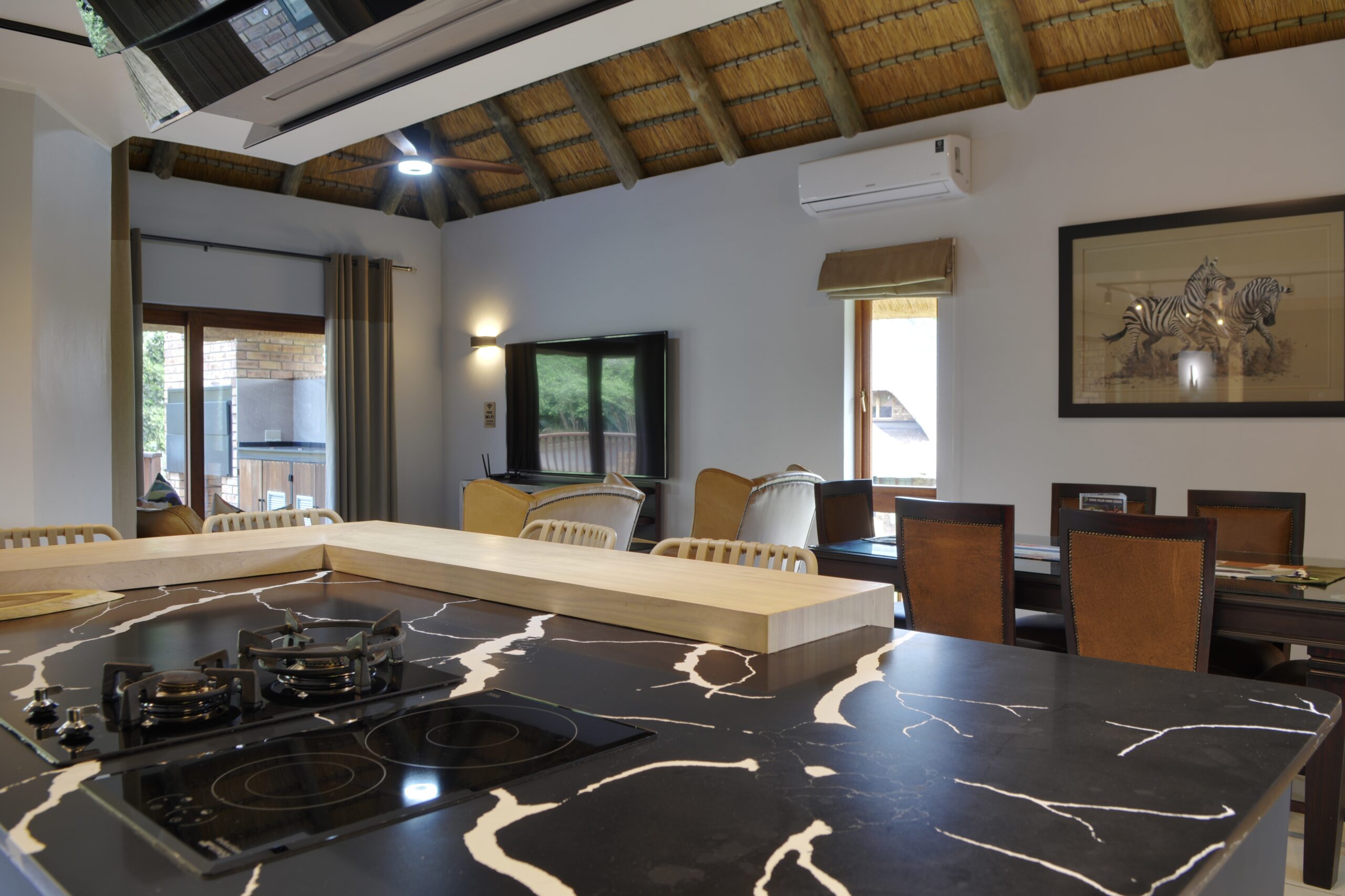 Matimba Private Lodge, with a stunning view, offers a serene escape with its modern design and luxurious amenities. Perfect for families or groups of up to six, this lodge features a private splash pool, a fully equipped kitchen, and a spacious outdoor entertainment area. Guests can enjoy access to the golf course, swimming pools, and restaurant, or embark on a safari adventure directly from the lodge.